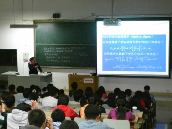 光是我们生活经常接触到的物质,一直以来对光现象的研究是许多学者的研究热点,光有力学效应么?带着这样的问题,4月28日晚19:30,《大学物理》系列专题报告在东校区第四教学楼309室如期举办。理学院博士生导师朱艳英教授应邀作了题为“光的力学效应—光镊理论研究与应用”专题报告,朱艳英教授通俗的语言、生动的比喻和讲解给在场师生留下了深刻的印象。