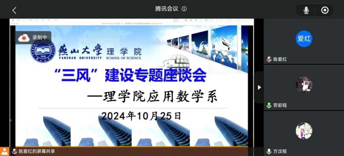 为进一步落实本科教育教学审核评估工作要求,加强公共数学课程三风建设,推动公共数学课教学质量不断提高,10月25日晚,理学院应用数学系通过腾讯会议组织了“三风”建设师生座谈会,本次座谈会由应用数学系主任方汶铭主持,来自全校机械、车辆、建筑、材料、电气、信息、环化、经管、西里西亚等9个学院的35位学生代表和应用数学系的5位公共课教师代表参加。