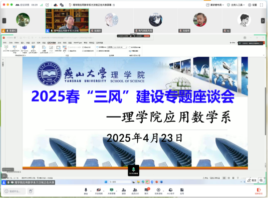 2025年4月23日晚20:00时,理学院应用数学系通过腾讯会议(线上会议号:305-558-463)组织了应用数学系“三风”建设师生座谈会,旨在进一步加强公共数学课三风建设,全面推进公共数学课教学质量不断提高。本次座谈会由应用数学系主任方汶铭主持,来自全校机械、车辆、建筑、材料、电气、信息、环化、经管、西里西亚、欧洲、理学院等11个学院的31位学生代表和应用数学系的10位公共课教师代表参加。