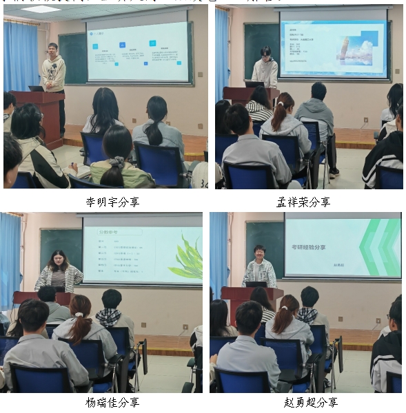 在经验交流会上,四位主讲人针对英语、政治、高等数学、专业课做了分享。主讲人强调要结合课程实际,制定复习计划,英语要注重单词积累-语法掌握-真题演练-模拟考试,政治要听课了解知识框架-背诵掌握知识要点-时政培养政治素养-做题助力查漏补缺,数学要借助知识习题夯实基础-通过历年真题强化突破-利用错题定位总结知识漏洞,专业课要做好信息搜集、时间安排和巩固练习。到复试阶段时,要研读教师的学术文章,了解研究方向,补充相关基础知识。此外,主讲人强调要调整好考研心态,做好压力管理与情绪调节、自我认知与信心建立、目标设定与自我激励,同时要学会利用碎片化时间,提高学习效率。在互动答疑环节,同学们积极提问,主讲人耐心细致地一一解答。