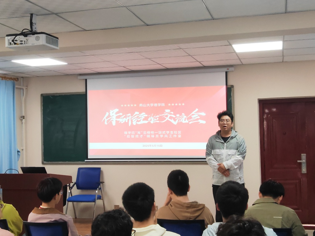 为帮助有保研意向的学生了解保研政策、明确努力方向。2025年5月15日,理学院在新时代大学生文明实践中心成功开展了保研经验交流会,本次活动由“启智成才”辅导员学风工作室承办,主讲人为信息与计算科学专业史鸿宇、现代物理专业陈铭泽和陈治锦,活动由理学院2022级本科辅导员张鹏飞主持。
