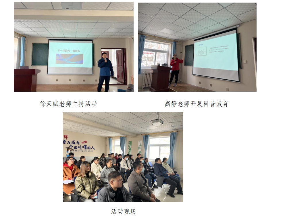 活动伊始,实验中心主任徐天赋老师介绍了此次科普活动的目的,强调了科普知识对提升科学素养的重要性。随后,实验中心高级实验师、物理科普演示实验室的科普讲解员高静老师以“不一样的光—偏振光”为题,从偏振光的内涵原理现象、偏振光的研究与发展、在生产生活和科学技术中的应用等方面出发,让同学们感受光的魅力。。