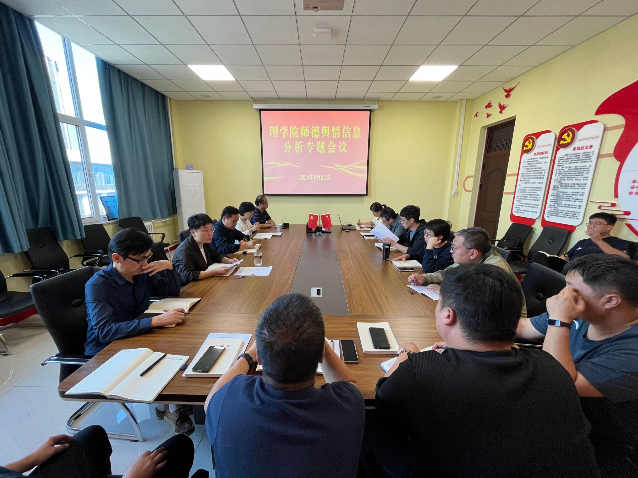 为深入了解教职工思想动态,进一步加强我院教师思想政治工作和师德师风建设,推动师德师风建设常态化长效化。9月23日下午,理学院师德师风舆情信息分析会在理学楼A506会议室召开。学院领导班子、党委委员、各系,中心主任参会,会议由学院党委书记刘琳主持。