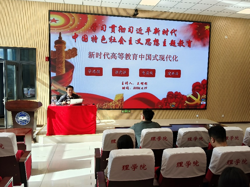 2024年4月18日下午4:00,理学院主持全面行政工作副院长王明利为理学院分党校第71期党员、发展对象和入党积极分子培训班学员讲授题为《新时代高等教育中国式现代化》的主题党课。