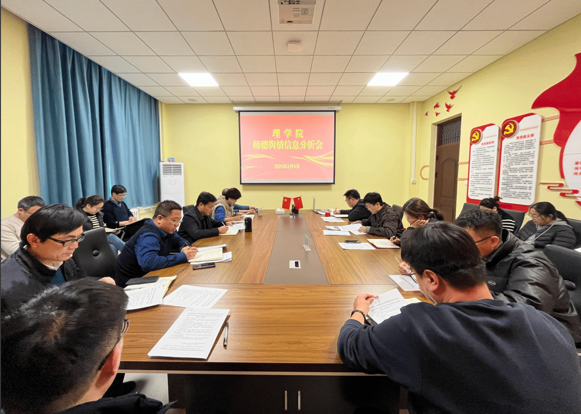 为深入了解教职工思想动态,做好舆情分析研判,进一步强化师德师风建设的主体责任,3月6日下午,理学院2025年春季学期师德舆情信息分析会在理学楼A506会议室召开。学院师德师风建设工作领导小组成员参加会议,会议由学院党委书记刘琳主持。