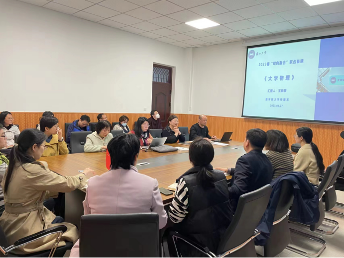 为提高大学物理课程与思政课同向同行,提升协同育人实效,按照学校和学院关于“双向融合”教研活动的安排,2023年4月27日上午,大学物理系全体教师与马克思主义学院的思政教师刘伟、宋彩红在理学楼A508举行了联合备课和教学观摩教研活动。会议由《大学物理BII》课程思政示范课程项目负责人张素红主持,理学院副院长王明利全程参加了会议。