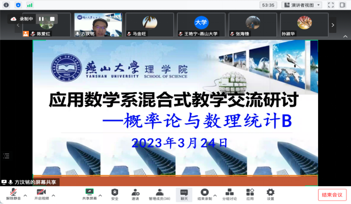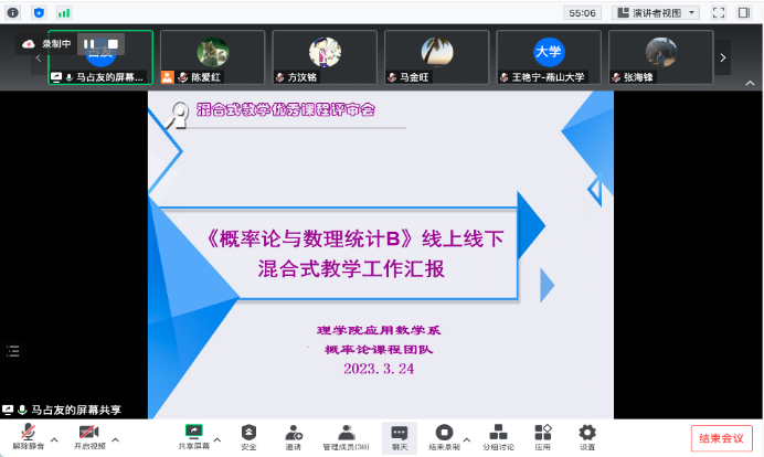 本次线上线下混合式教学研讨围绕《概率论与数理统计B》课程展开,系领导首先向全体教师介绍了马占友、王艳宁、田瑞玲和马金旺等教师为《概率论与数理统计B》课程开展线上线下混合式教学所做的大量前期工作和辛苦付出;并邀请马占友教授代表课程团队向全体教师汇报了《概率论与数理统计B》课程开展线上线下混合式教学实践的具体工作。