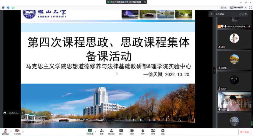 最后,教务处马明建老师对本次联合备课给予了赞扬和肯定。理学院党委书记严冰老师感谢学校为理学院提供的学习交流平台,感谢马克思主义学院老师提出的宝贵意见和经验分享。理学院开展课程思政工作也在一步一步进行,通过本次联合备课,让老师在以后的教学工作中能更好的效果。这次备课只是一个开始,期待以后有更多的沟通和交流活动。徐天赋老师总结,通过本次集体备课活动,对课程思政和思政课程的认识更加深入,更加了解思政内涵。从马克思主义学院的各位老师的精彩发言中也获得了上好实验课程思政的很多灵感。也希望教务部门更多的组织学习交流的机会,一起为提升教学质量,更好的培养学生做出自己的贡献。