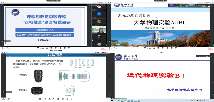 结合大学物理实验特点,马克思主义学院王玉荣老师提出自然科学与社会科学本质有着密切的联系,并推荐阅读了四本书籍;雷霆老师提出中国共产党人的46种精神谱系是非常合适的思政切入点;常玉洁老师提出一门课程的思政元素不需要太多,应以国家发展战略需求为参考;李建芳老师强调专业课和思想政治课都要服务于育人的目标,但不要为了完成这个目标,生硬的进行拼接;孙金生老师从学生职业素养要求上进行思政元素的挖掘,为思政开展提供了新思路。郭清秀老师总结到,一是课程思政的内容可以阅读大学生思政课的教材以及马克思的博士毕业论文;二是课程思政的方式不必纠结表述方式,可以不拘一格,像盐一样,点到为止,言有尽意无穷;三是目标,自然科学和社会科学目标一致,讲真求真找规律,需要在生活实践中收集总结。