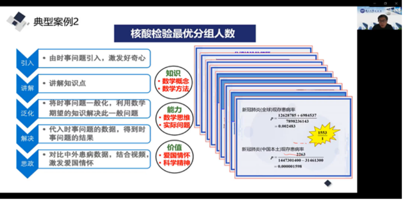 应用数学系安排了王艳宁、李坦、孙虹霞三位教师分别就《概率论与数理统计B》(省级示范课)、《高等数学AI》(校级示范课)、《复变函数与积分变换A》3门课程进行了课程思政示范课汇报。三位老师分别从课程整体开设情况,课程思政教学设计思路,典型案例,教学实践情况、所获荣誉和后续建设计划等不同方面向与会教师进行了详细汇报。每门课程汇报结束后,毛概教研部安排指定教师进行细致点评,所有点评老师一致认可这3门课程的课程思政工作,充分肯定了课程思政案例。大家一致认为案例详实充分,设计生动有趣,涵盖古今中外,有国家重大工程,有数学史,也有数学大家,很多例子和生活息息相关,案例与数学课程知识点的融合也非常好。同时他们也提出了中肯的意见,认为可以在现有案例的基础上进行进一步拔高,可以考虑将其中的部分案例与国家的二十大科教兴国战略相融合,可以将燕大自身参与的国家大工程融入等建议,给出了思政的专业思考。双方就课程思政案例的解读进行了热烈地讨论和交流,在不同的视角碰撞出思想的火花。