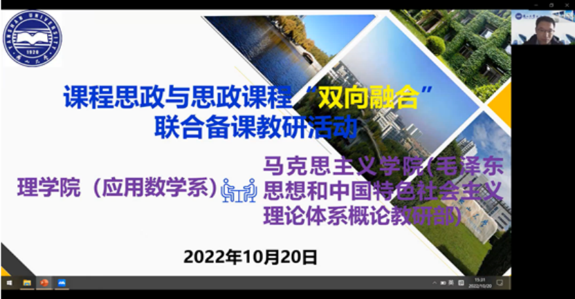 2022年10月20日下午15:30—17:30,理学院应用数学系和马克思主义学院毛泽东思想和中国特色社会主义理论体系概论教研部(下称毛概教研部)开展了一场别开生面的课程思政与思政课程“双向融合”联合备课教研活动,会议通过腾讯会议在线上举行。理学院副院长胡林敏,应用数学系方汶铭、张海锋、陈爱红、王艳宁、李坦、孙虹霞等38位教师参加,马克思主义学院毛概教研部李晔、梁明伟、李忠华、李婷婷、关丽兰5位教师参会。此外,还有教务处姜新老师与会指导。