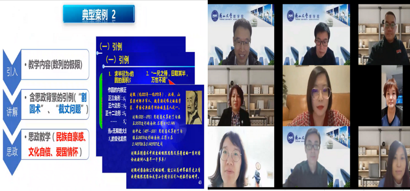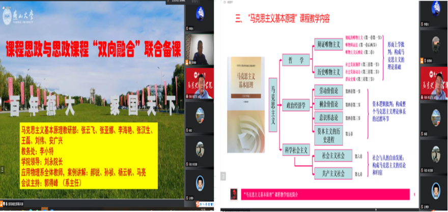 考虑疫情防控要求,本次教研活动通过线上(腾讯会议)的方式进行,由学院7个基层教学单位分5组,邀请马克思主义学院骨干教师分别开展,每组有一名教务处人员和一位院级领导参加。刘永院长、严冰书记和王明利副院长、胡林敏副院长和曾慧副书记分别参加了应用物理、实验中心、大学物理、应用数学、信息与计算科学和统计学的线上教研活动。